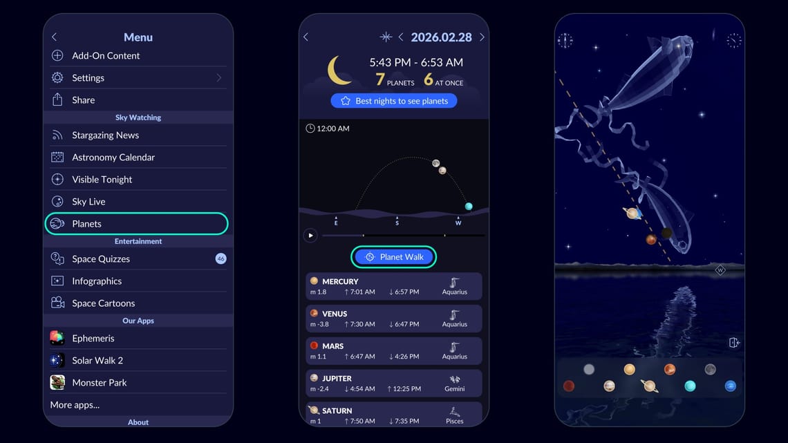 Use the Planet Walk feature in the Star Walk 2 app to quickly find all six planets in the sky during the alignment on February 28, 2026.